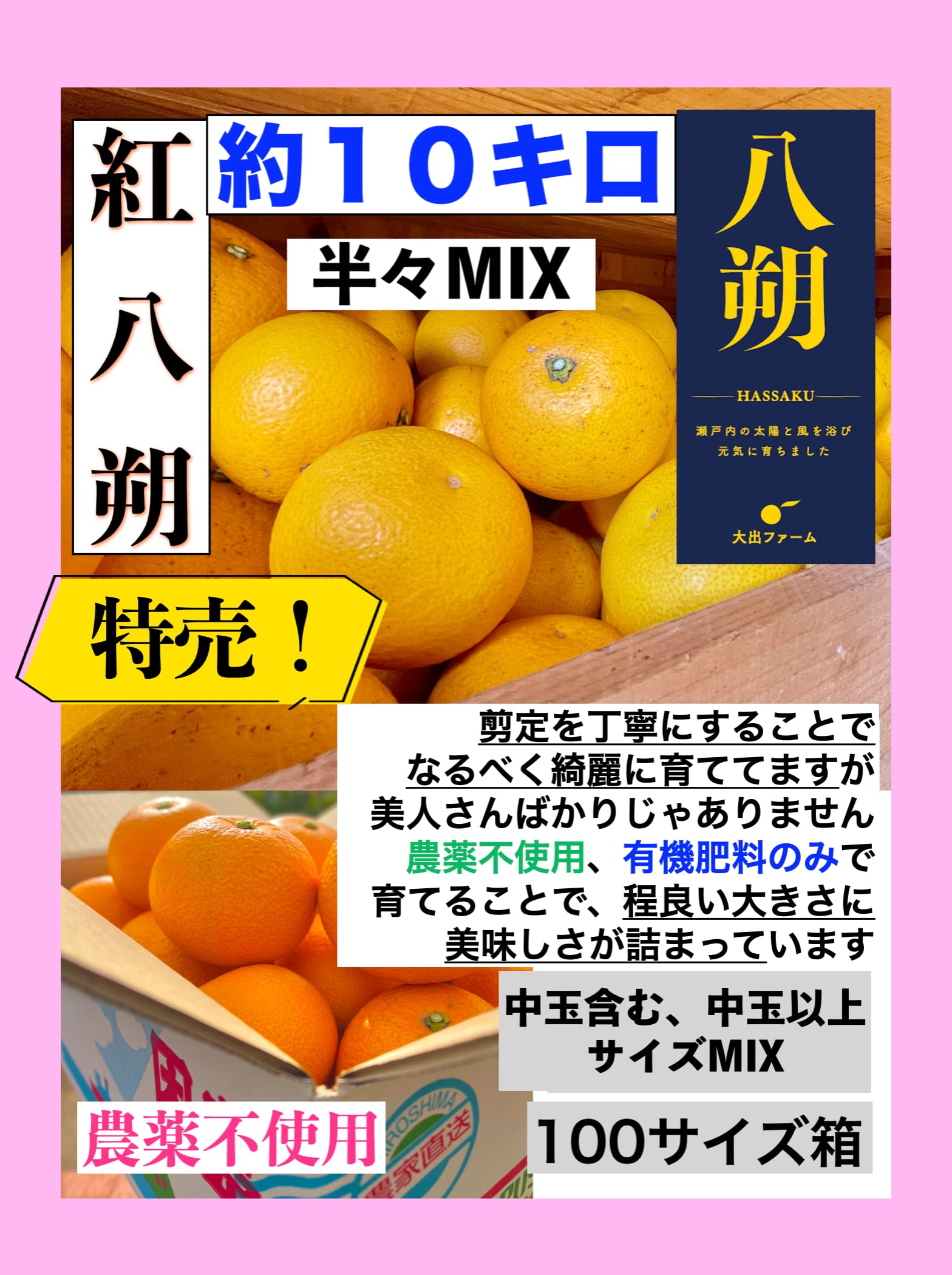 旬になりました!たっぷり食べてもらえるように中玉も少し多め、中玉以上サイズMIXで、お値段も安く特売させていただきます!